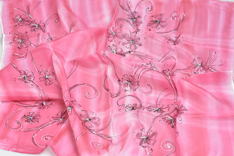 Elegantní ručně malovaný šátek ze 100% přírodního hedvábí udělá radost každé ženě či dívce.