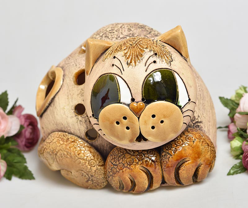 Ručně modelována, častečně glazovaná keramická kočka. Vhodná jak do interiéru tak do zahrad, na terasy či balkóny. Dovnitř lze vložit svíčku, při zapálení plamínek krásně svítí přes prořezy.