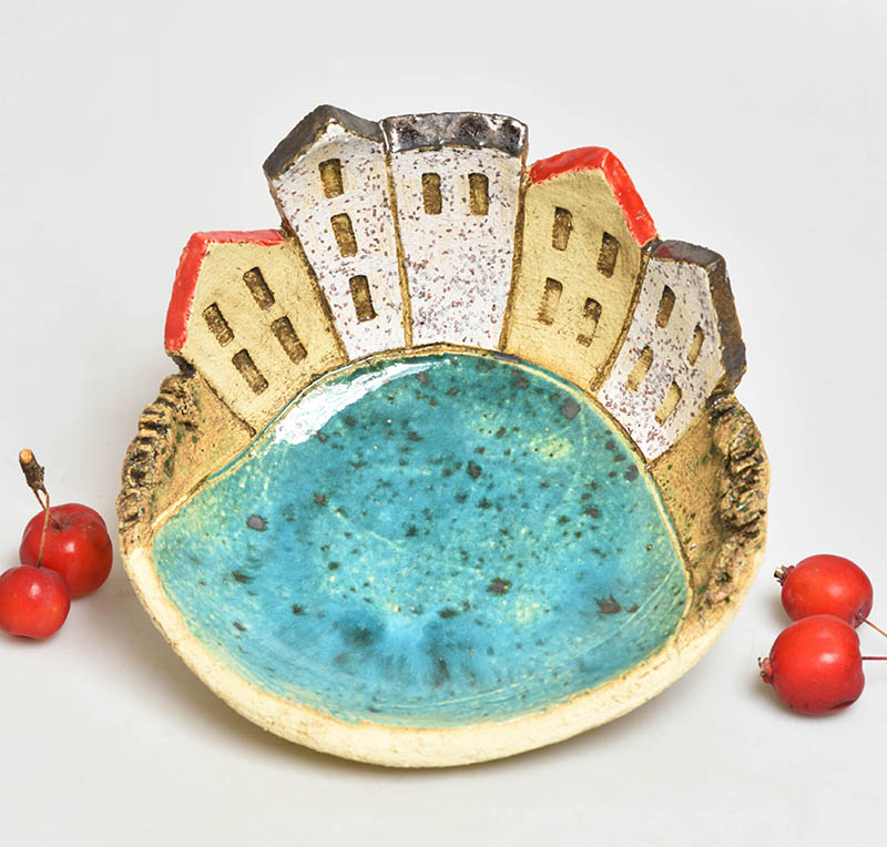 Keramická dekorativní mistička ručně vyrobená s motivem domečků se zajímavou tyrkysovou glazurou. Krásna dekorace která se bude vyjímat na vašem stole.