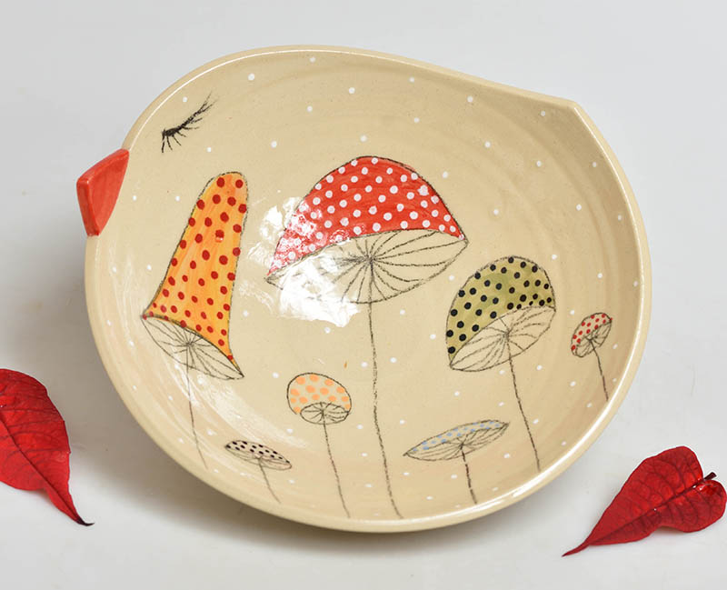 Originální ručně točená a malovaná keramická miska s motivem hub vhodná nejen jako dekorace, ale i pro běžné použití na müsli, oříšky, chipsy...... Je vhodná jak pro ohřev v mikrovlné troubě tak i pro mytí v myčce.