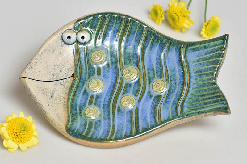 Originální ručně vyrobená a malovaná keramická miska ve tvaru rybičky vhodná na odkládání drobných předmětů například šperků nebo jen dekorace interiéru a exteriéru.