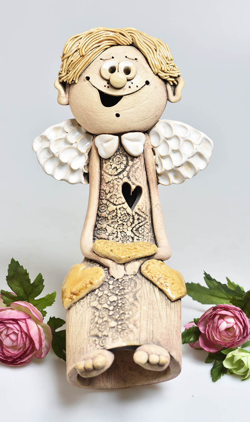 Veselá soška anděla je ručně modelovná z keramiky a dozdobena glazurou. Anděl Vám může dělat dekoraci po celý rok, na konci roku bude zároveň krásnou vánoční dekorací.