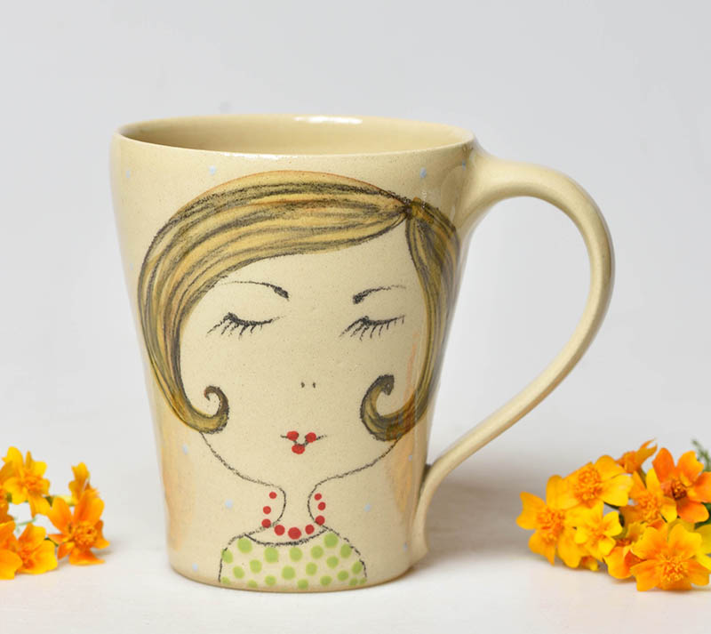 Ručně točený a malovaný keramický hrnek s krásným dívčím obličejem na čaj, kávu.... Je vhodný jak pro ohřev v mikrovlné troubě tak i pro mytí v myčce.