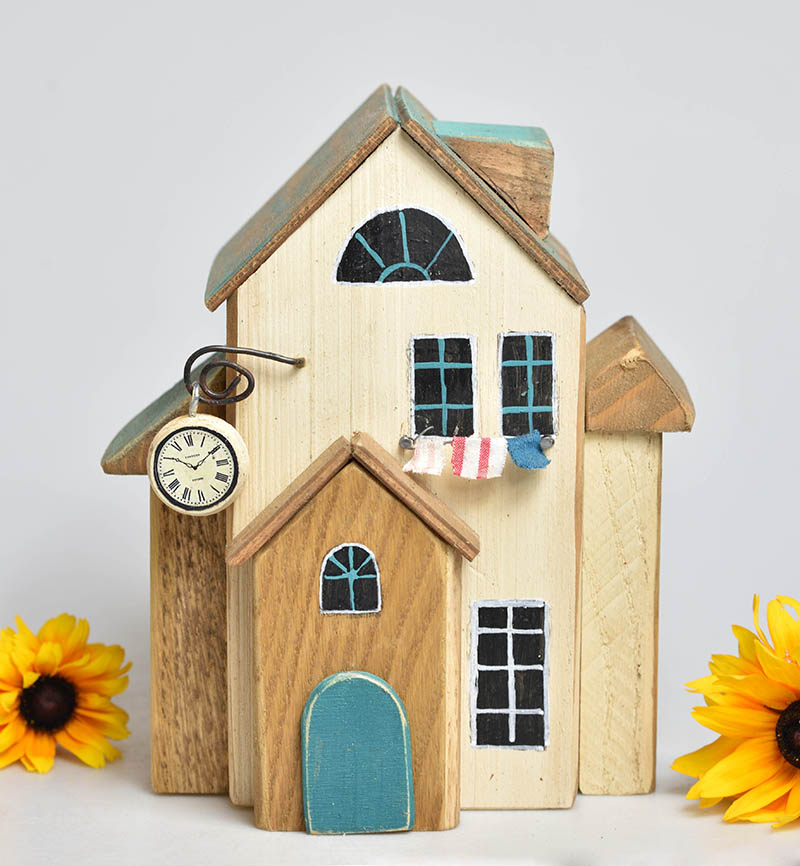 Dřevěný domeček je ručně řezaný a barvený akrylovými barvami. Určeno do interiéru.
