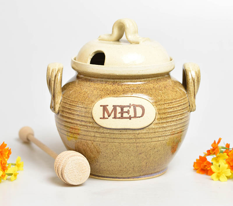 Ručně točená z hnědé hlíny, glazovaná béžovou glazurou keramická nádoba s víkem na med. V pokličce je výkroj na naběračku medu, která je součástí. Dóza je určena a atestována k běžnému používání.