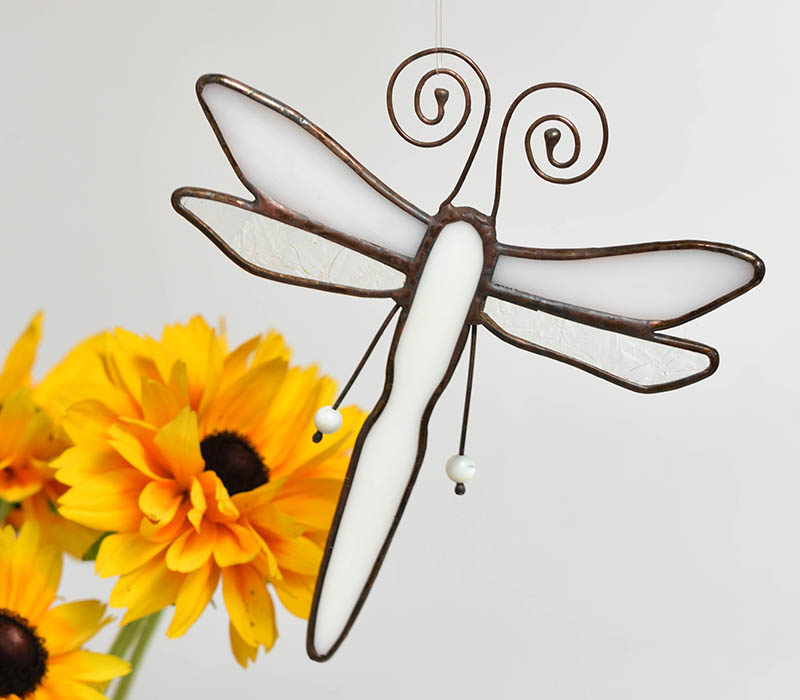 Ručně vyrobená vážka z vitráže doplněná korálky z perleti, zhotovena Tiffany technikou z kvalitního skla a cínu. Každý kousek skla je pečlivě vybroušen a spojen cínovými spoji, což vytváří harmonický celek plný jemných detailů. Tento originální kousek je nejen dekorací, ale i výjimečným uměleckým dílem. Pověsit ji můžete na zeď, do okna nebo do prostoru. Vážka je dárkově zabalena.